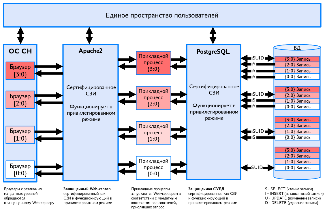 Этим достигается разграничение дискреционного и мандатного доступа к данным и процессам, в том числе и при дальнейших запросах к базам данных.